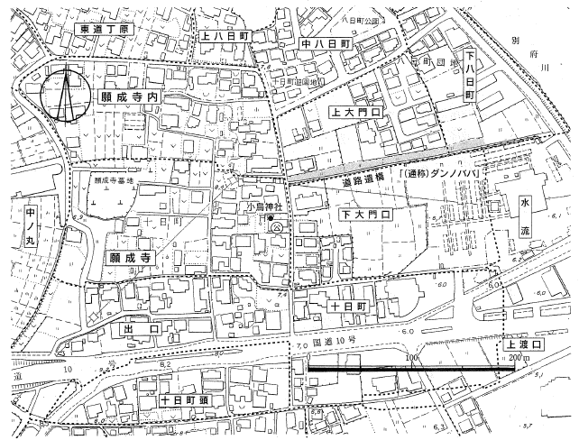 別府川の舟運による商業の要所として栄え、多くの人々がこの地に集まり、信仰を寄せ