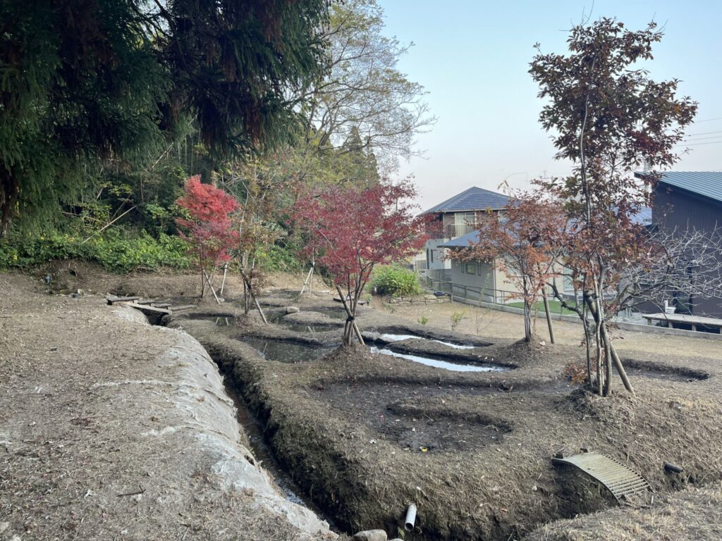 では早速、秋の剪定&草刈り&ビオトープ清掃が完了しましたので報告いたします。ココは、分譲地の子ども達をはじめ、その家族が、土・水・生物・樹木・炎・空気etc・・・を肌で感じ、自然と直接触れ合うことができる場所です。